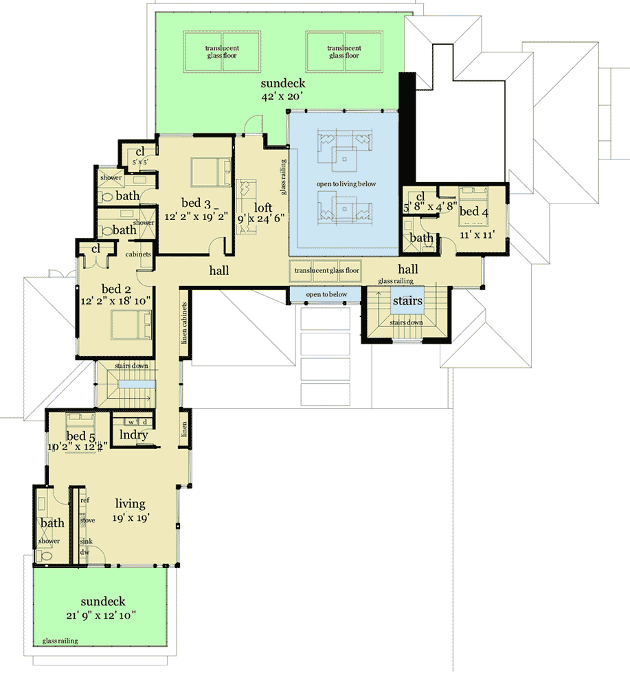 This is a large modern house plan with a central 2 story living space. The entry walk steps across the reflecting pond and waterfall.
