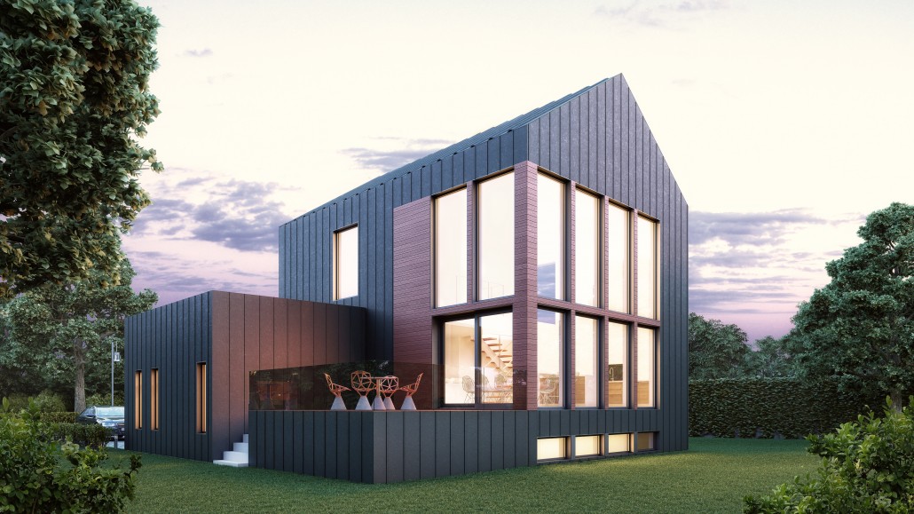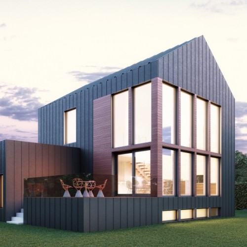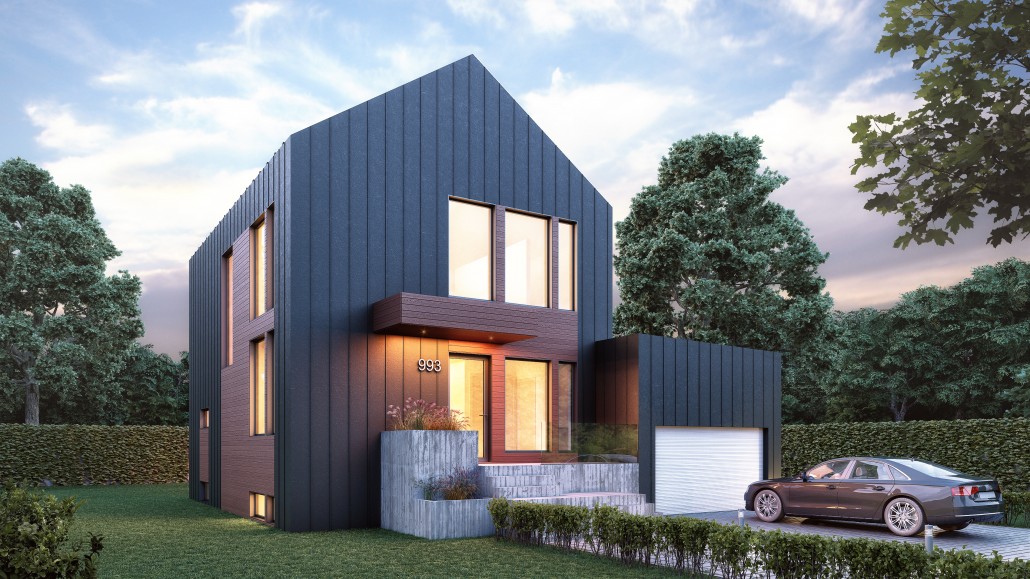 This inspiration has been designed for an urban or smaller country setting in a lot size usually around 50 feet long. There is a main open-plan living space with a garage attached. The model’s large windows maximize natural light and enhance the feeling of interior space. Its dark grey steel with reddish wood planks for the facade give it an urban feel that is also reminiscent of a barn-style country home.