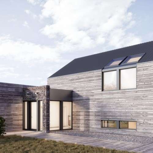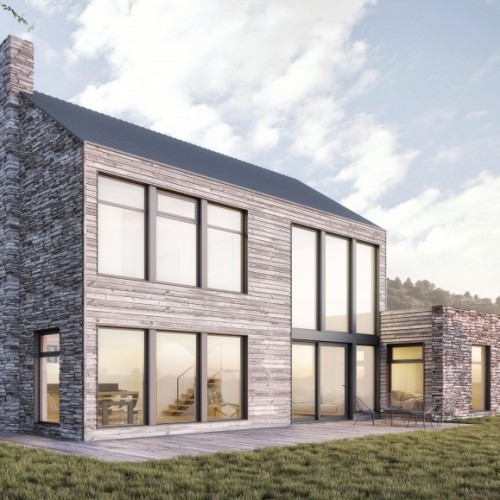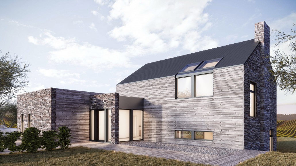 From the outside, this country home is striking for its juxtaposition of traditional natural wood and local stone. Oversized windows allow light to flood the interior spaces, while its location on a sloping lot offers fantastic views of the surrounding countryside. The whole house forms an angle that embraces a huge private patio at the lower level and features two volumes, one a main living space on two floors with a fireplace as a focal point, the other a broad horizontal volume connected to the garage.