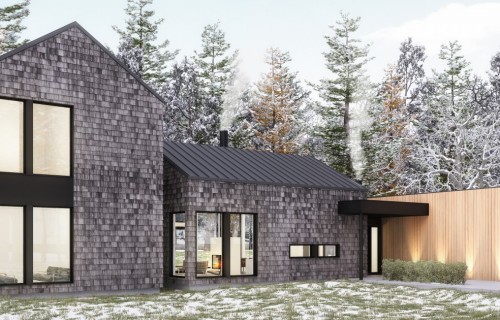 A large, single-family dwelling that features clean lines and, simple, fresh materials for a contemporary look that fits perfectly in a countryside location. An outdoor rear patio and a long-span view from the entryway to the back garden create a soothing connection between house and nature. Visual continuity throughout and several skylights produce an airy, bright principal residence or cottage that stays cozy in winter as everyone gathers around the fireplace.