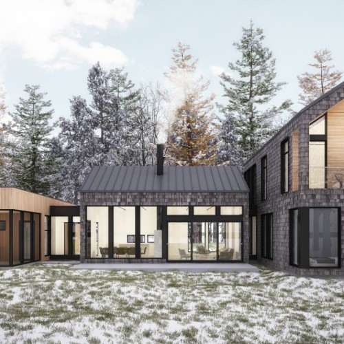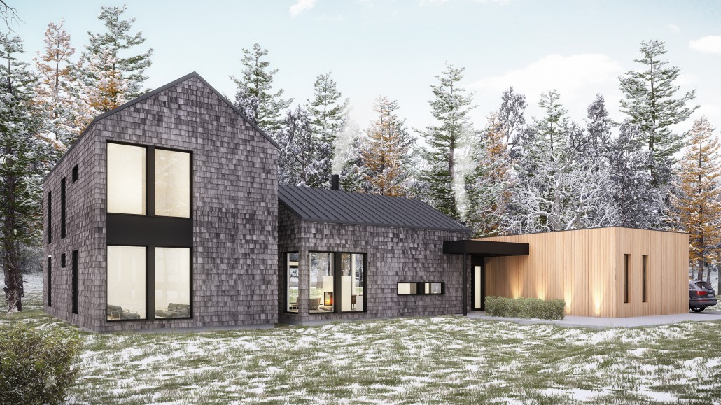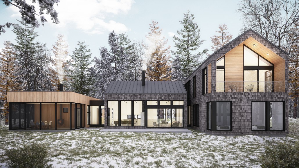 The main living space is a huge 25′ x 30′, with a kids’ play area plus two bedrooms. All three volumes are connected by glass breezeways as a link between nature and coziness. Oversized windows in the upper floor’s spacious master bedroom connect the interior space with the great outdoors. But if you want to actually go outdoors, there’s also an adjoining carved-out balcony patio. A mudroom, laundry and powder room are connected to the 2-car garage and storage space.