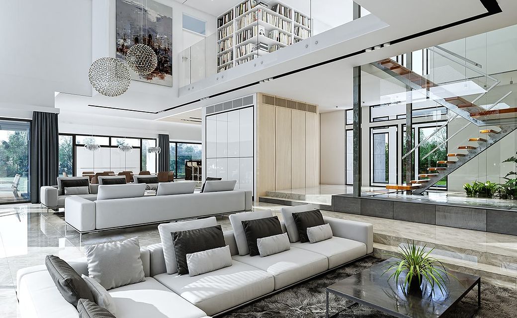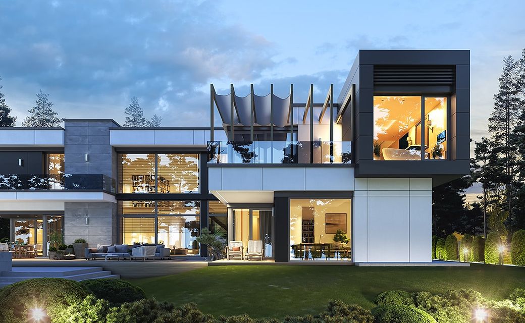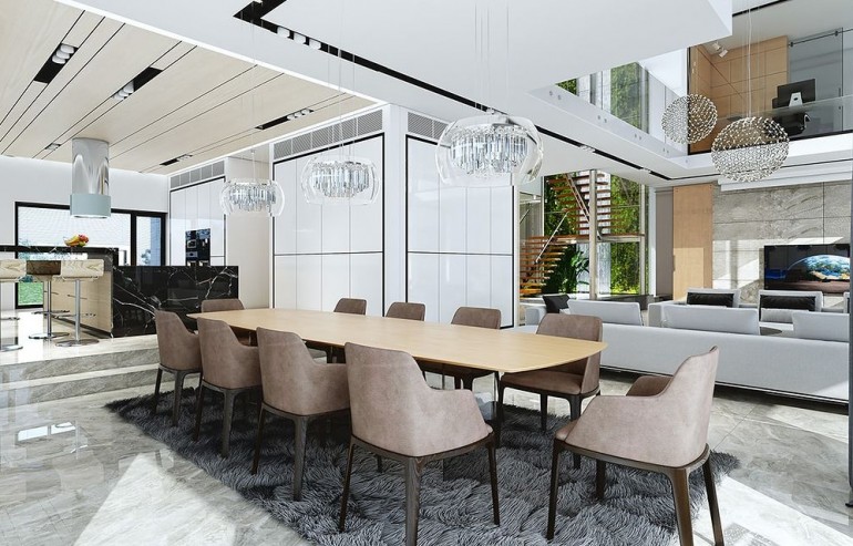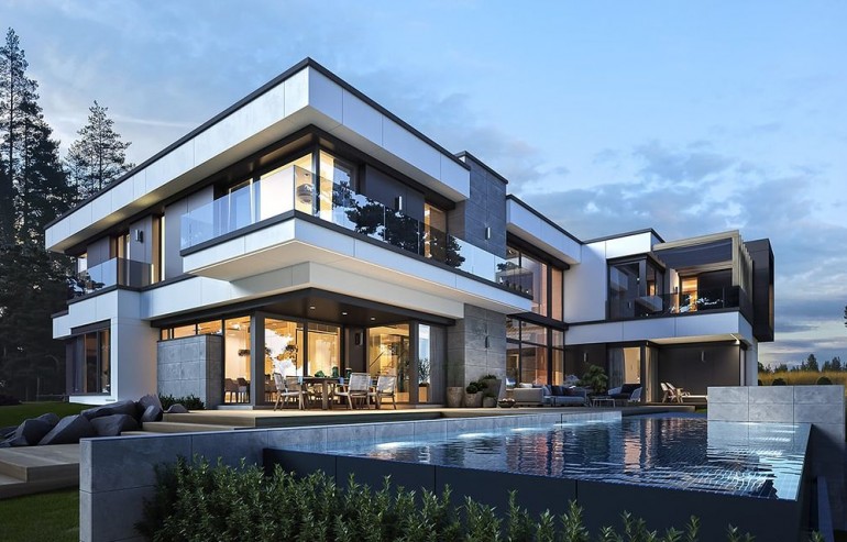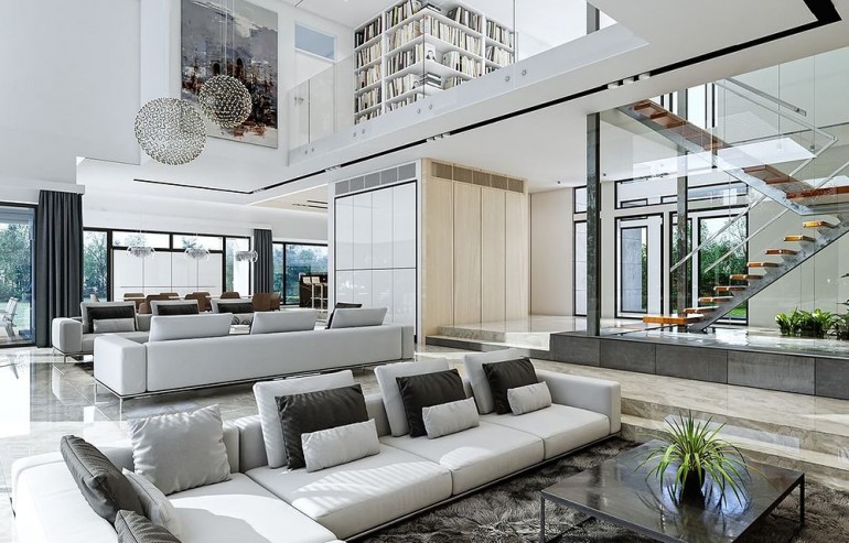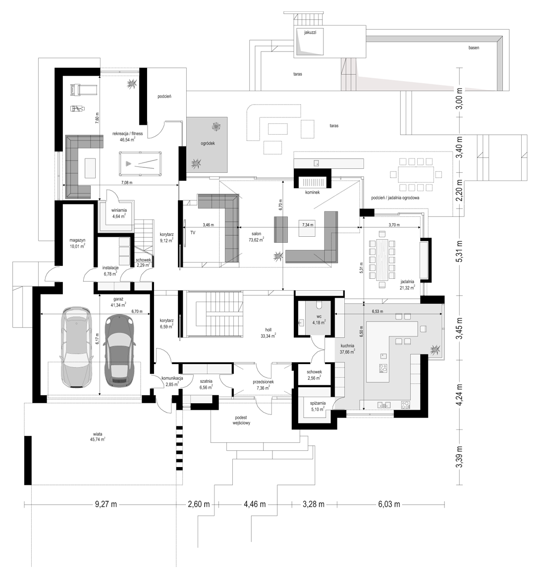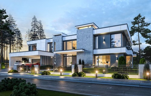 House design Florida Residence 2 is another luxurious house from the series: Villa and Residence Florida. We have designed a super-comfortable villa with modern architecture, flat roofs and large glass walls connecting a representative interior with a garden. The leading idea of shaping the body and interior of the building is the interpenetration of rectangular walls and horizontal panels with openings and glazing, creating a play of lights and framing views of the interior and surroundings. Thanks to this assumption, the building is more interesting and less monotonous. At the same time, the whole architecture is closed in a network of consistently repeating details, giving the entire structure an appropriate rhythm and order. Florida 2 Residence, although it has a very modern style, is not overly extravagant. The architecture of the building can be a good background for both a modern interior and a more eclectic one - broken with antiques or a glamor-style arrangement. The serene and sober style of the house will certainly stand the test of time. We enter the Florida Residence 2 through a two-story glazed vestibule to the hall, over which the first floor forms a bridge - a mezzanine between two voids: the living room and vestibule, and the front and garden glazed facade. Such an interior divides the building into half with a two-story open living room. On the right, on the ground floor, we have a large family kitchen and a dining room, and on the first floor there are children's bedrooms. On the left side of the residence there is an economic and technical part, as well as a recreational and fitness part, and on the first floor there is an apartment of your home, and a separate apartment with a separate intimate access - for home service or guests. The central lounge of the villa blends with several other interiors on the ground and upper floors, creating a truly huge, free space for everyday life. Here we have two sets of lounge furniture - by the fireplace and by the multimedia wall. The living room is connected with the dining room and kitchen, the hall is decorated with monumental stairs, leaning against a stone and water wall - a waterfall with a water tank at the foot of the stairs (the water wall and the tank are the natural air conditioning of the interior building). The living room is also connected with the hall on the first floor (which is the home library), and with the office - through an impressive glass wall. The living room also opens onto the garden and terraces of various heights, a jacuzzi and a swimming pool. Upstairs, the parents' and children's apartments have their own bathrooms and wardrobes. The master bedroom has wardrobes for him and her. Florida Residence 2 is a one hundred percent luxurious house, fulfilling the dream of a truly comfortable and convenient life. The Florida 2 Residence is a showcase of the owners, confirming their high status and good taste. We are already jealous and admire the lucky ones who can afford to build this gem.