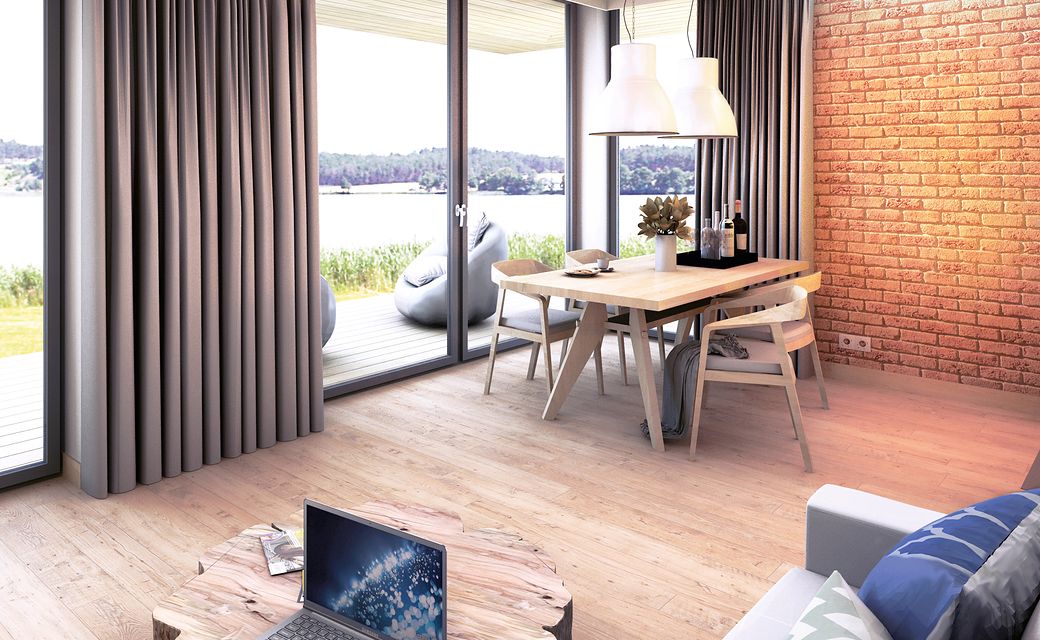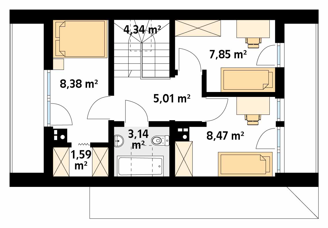It is a tiny house design with a usable attic, characterized by a modern shape and a functional, for a small area, arrangement of rooms. The shape is simple and compact. It is finished with a standing seam sheet and large glazing in the tops of the building, which makes it look very modern. Carefully developed proportions, subdued colors and natural finishing materials make the house look attractive and minimalist.