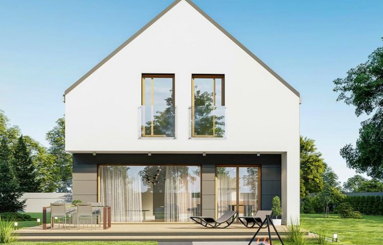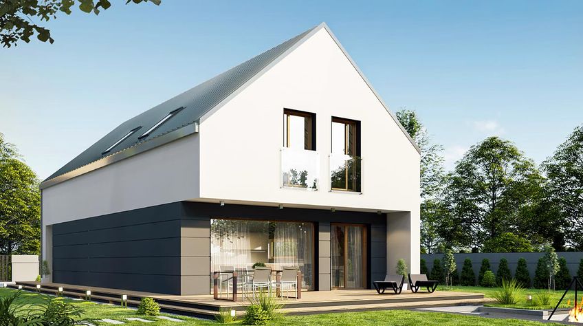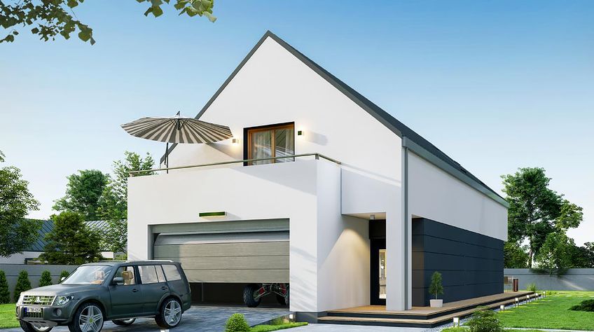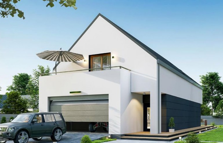 House plan with attic Slim A2G with a spacious garage, gable roof, terrace.