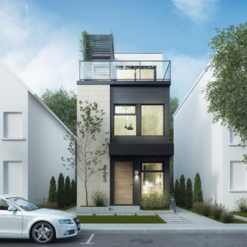 This inspiration is a split-level concept featuring a triple-height space with skylights above the central staircase. The master bedroom has higher ceilings, while the kitchen and dining area are in a semi-basement with a patio door that leads to the exterior sunken backyard.