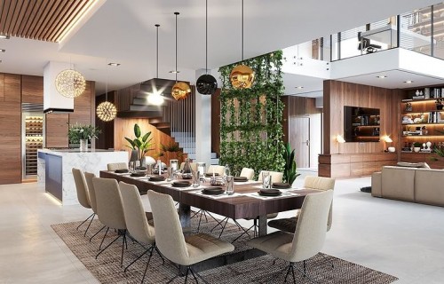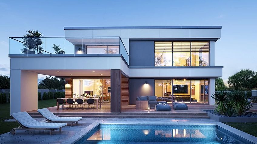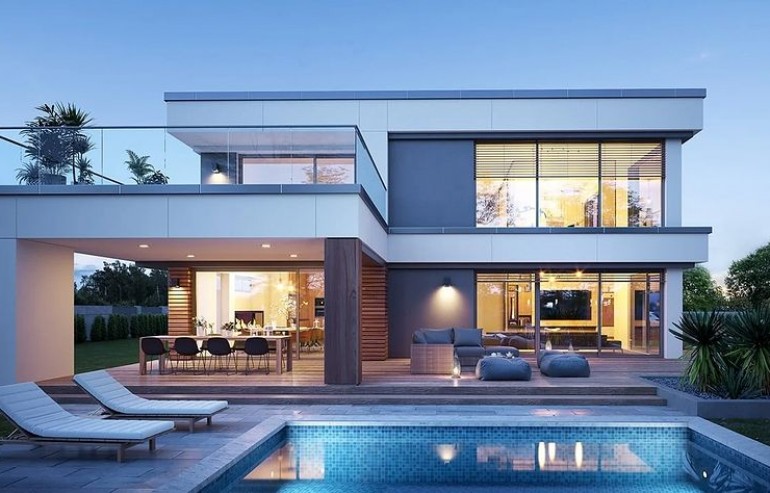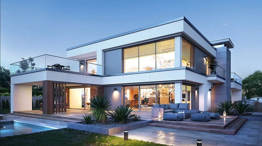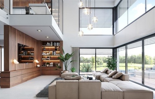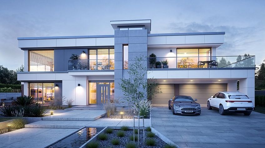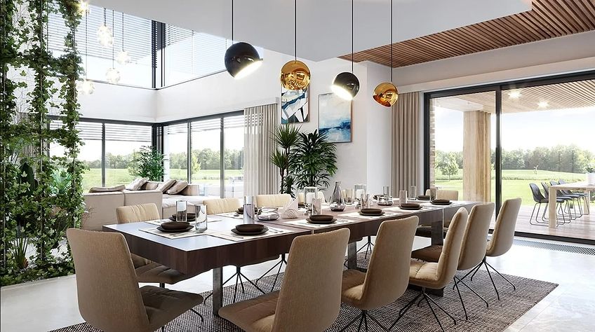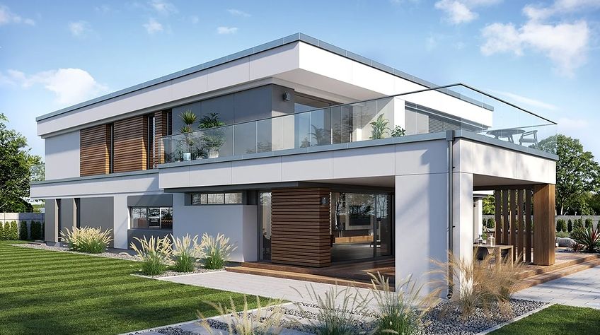 The Villa Florida 5 house plan is another luxury mansion project from the "Willa Florida" series. The house is a comfortable, two-story villa, intended for a plot with a side or front garden. The architecture of the house combines a modern form with a functional interior. Stylish, varied shape and representative interior will emphasize the status and good taste of the owners. The fragmented two-story silhouette of the house is covered with a hipped roof, practically invisible from the height of human eyes, giving the impression of a building with a flat roof, with - in fact, a sloping roof (a frequent requirement in the building conditions). The elevations have been divided into strips of windows interwoven with white beams separating the storeys, introducing rhythm and order. We enter the building through elegant wide entrance doors with side lights under the balcony roof. The front of the house is decorated here with a vertical two-story wall with skylight, large windows in the corners of the facade, and a comfortable carport in front of the three-car garage. The garden façade in Villa Flory 5 is the side façade of the house with a large covered terrace - a place for evening feasts, and large corner glazing of the living room. The interior of the ground floor is primarily a huge single-space area of the hall, living room, dining room and kitchen rooms. It is almost 150 m2 of free, open living space. There is a representative staircase to the first floor, a living room with a large void and opening to the mezzanine above, with a delightful lounge suite and a TV wall. We have a dining room with a table for 14 or more people and a beautiful gas fireplace, we have a kitchen with an island, and a garden in the center for representative plants, and plenty of space to display unique paintings and other works of art. Everything is bathed in the light of wide, two-story glazing. In the back room, behind the kitchen, we have utility rooms such as a laundry room, pantry or boiler room. At the entrance: a cloakroom, toilet and access to a three-car garage. The first floor is the master bedroom with wardrobes and a bathroom, and an additional spare room and two children's bedrooms with their own second bathroom. A beautifully glazed home office or library room hangs above the living room, and a mezzanine opening onto the ground floor and the garden. All rooms on the first floor have access to the surrounding terraces. The master bedroom has a separate very large terrace overlooking the garden. Willa Flory 5 is another proposal of a large luxury house for brave Investors who want to fulfill their dreams of a unique place to live, who want to enjoy remarkable - modern at the same time non-flashy and tasteful architecture.