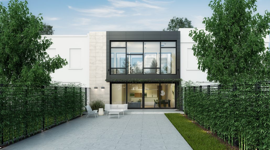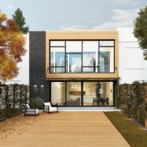This inspiration has an interior courtyard on the top floor inside the building, with double-height ceilings at the back of the building in the living room and dining room. The latter features a 20-foot patio door and a glass curtain wall leading out to a backyard JNCN HOMES pergola.