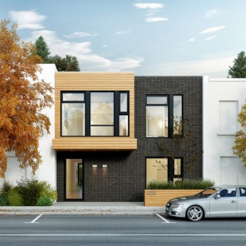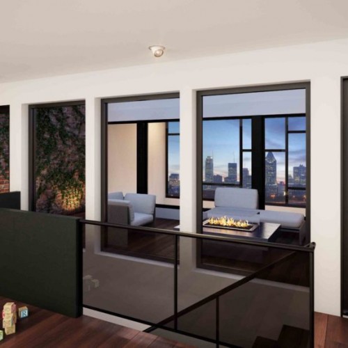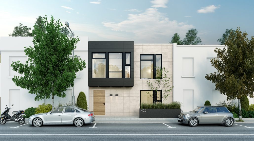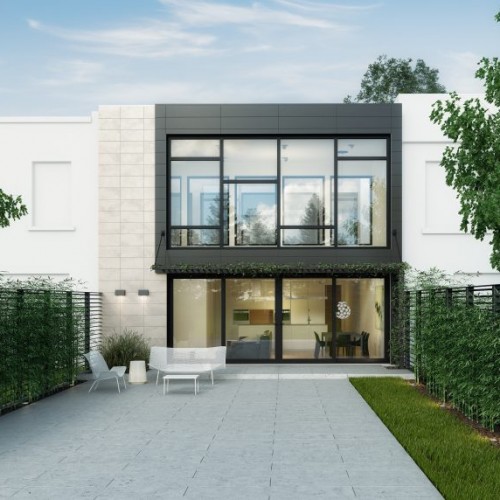 This inspiration has an interior courtyard on the top floor inside the building, with double-height ceilings at the back of the building in the living room and dining room. The latter features a 20-foot patio door and a glass curtain wall leading out to a backyard JNCN HOMES pergola.