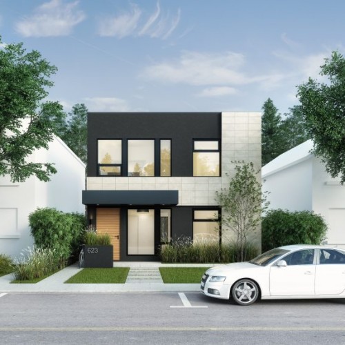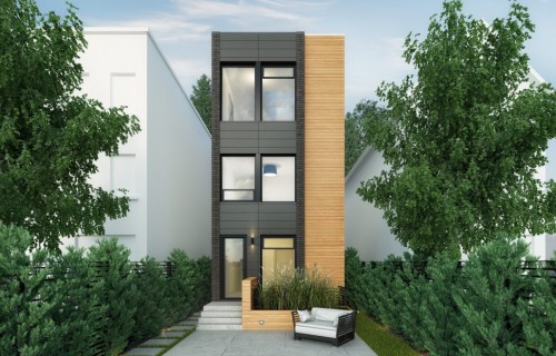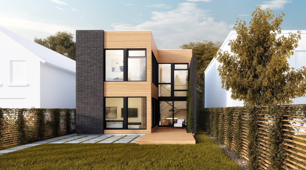 With ample natural light provided by a cutout and double-height glass wall at the rear of the building, the design of this inspiration strikes a perfect balance between creative use of interior space and mood-enhancing light. From an entrance through a mudroom and laundry room, the main floor’s social space is open concept, with a dining room situated on the double height between the staircase and backyard patio, and the living room further back, separated from the kitchen by a fireplace. On the upper floor, the staircase divides the spaces, with the master bedroom at the back of the house and the other two bedrooms at the front. The master bedroom features an open-concept bathroom to catch natural light from the double-height glass wall.