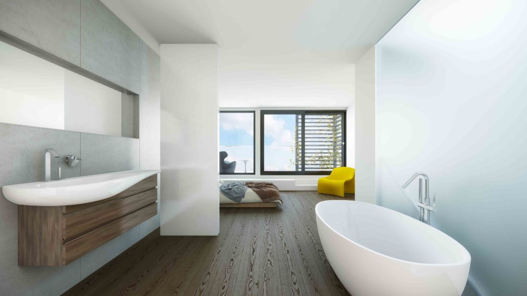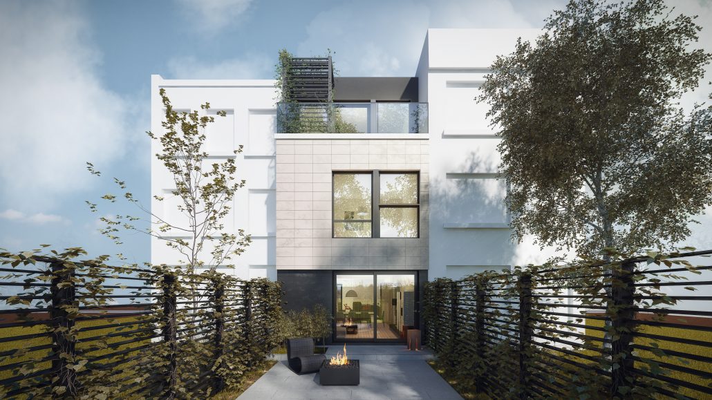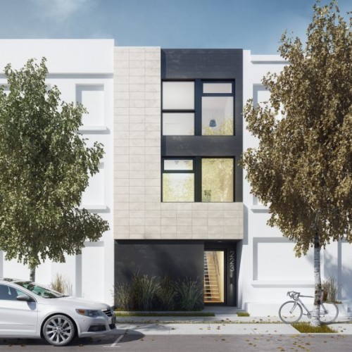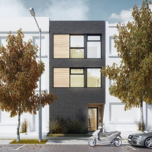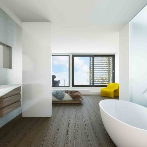 This inspiration features a triple-height void along the staircase topped by a skylight that offers natural light throughout the floors. There are two bedrooms that share a bathroom on the first floor and a master bedroom on the upper floor.