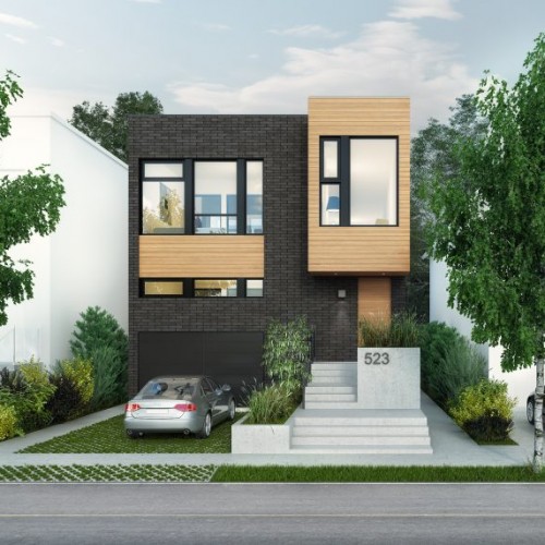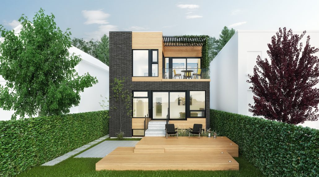 This inspiration has an interior courtyard that separates the kitchen and dining room at the back from the living room at the front of the building. There is a social space with higher ceilings on the upper floor and a single-car garage with a mudroom.