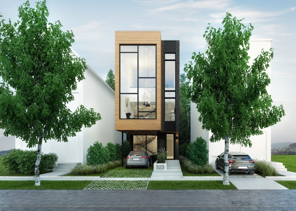 From the outside, the remarkable features are a large cantilever that forms a covering for the car port and smaller one extending from the living room to cover the entrance. Since the kitchen and dining area are on the top floor, we incorporated a service elevator from the main floor laundry room to the pantry on the upper floor. The social spaces have much more light because they are on the top floor, and natural light floods in through double-height living room windows.