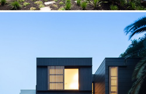 The Exterior Of This House Has Blackened Wood Siding With Contrasting Light Wood Shutters