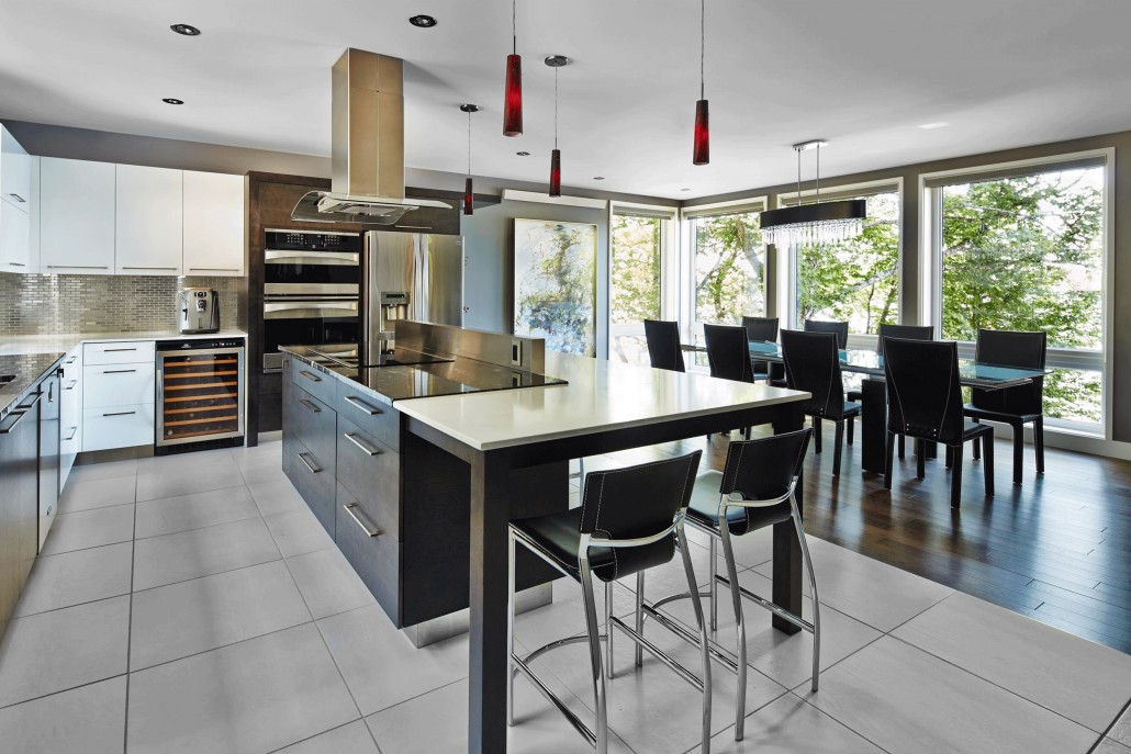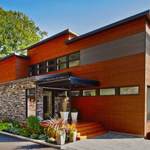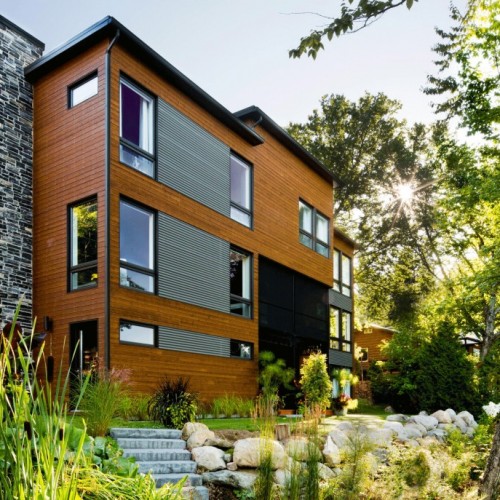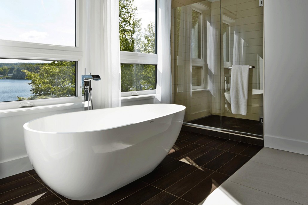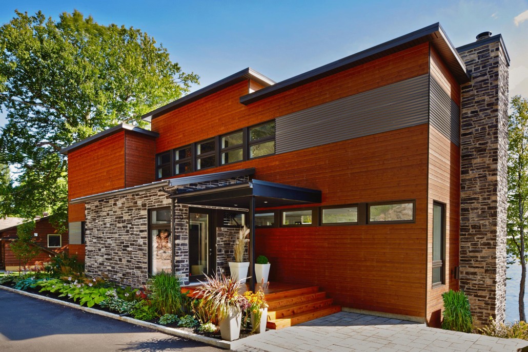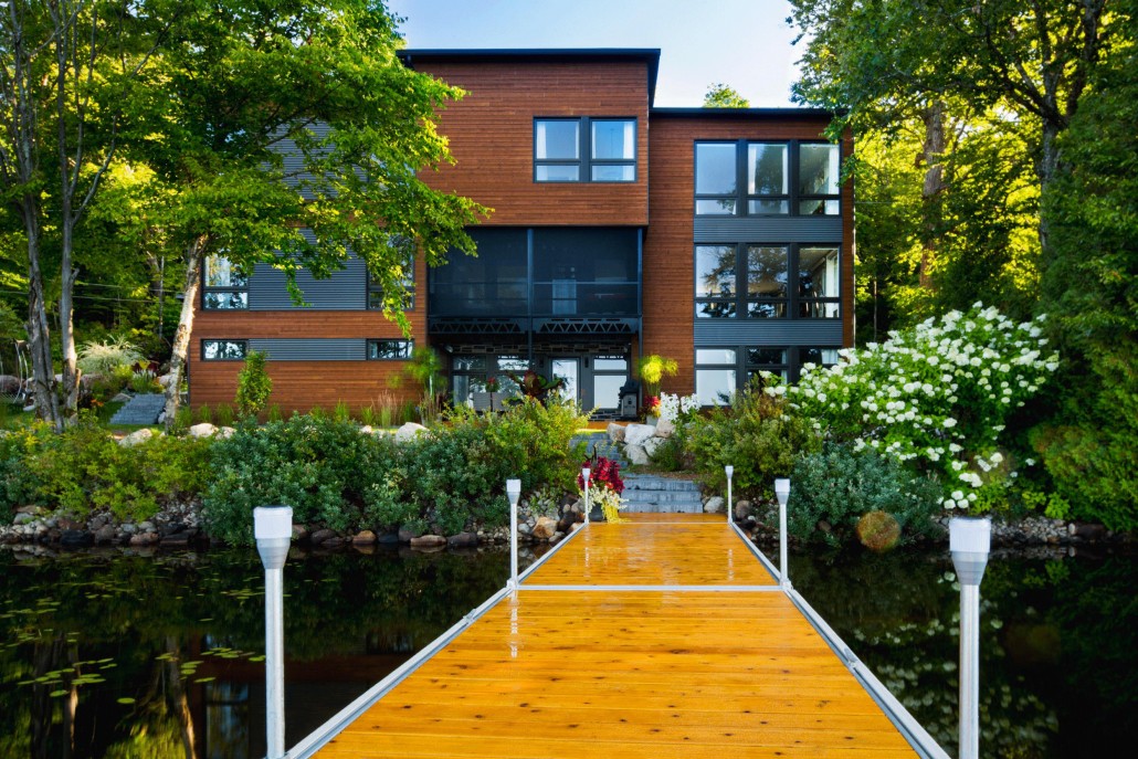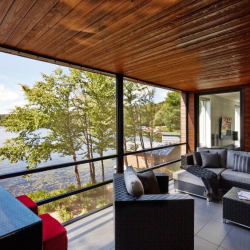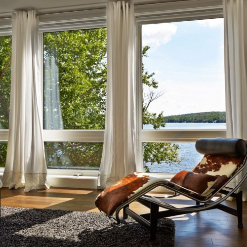 A lakeshore property with breathtaking views all around every floor, this country house is home to a couple with two small children. An eye-opening feature is the stylish staircase leading up from the large first-floor living room. The beautiful open-plan kitchen adjoins the dining room and living area, while the upstairs master bedroom also benefits from the view through massive windows. A basement provides additional living space, while the back of the house is fenestrated downward toward an original deck in the backyard.