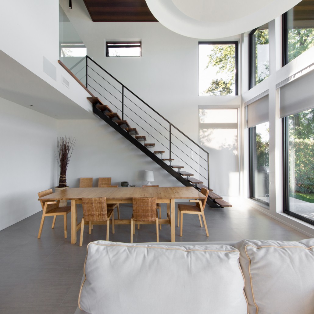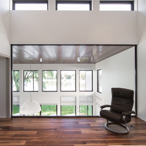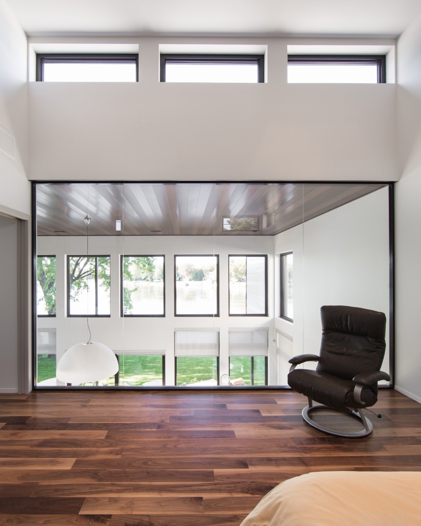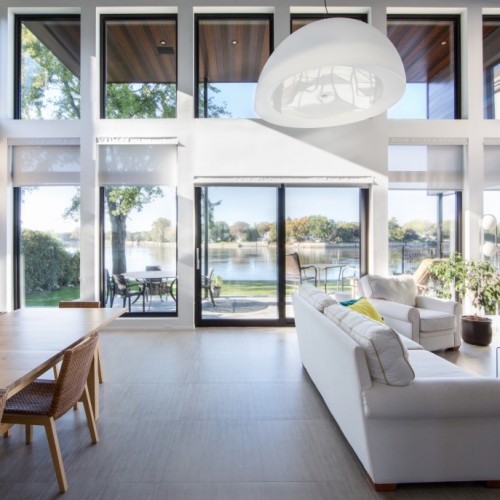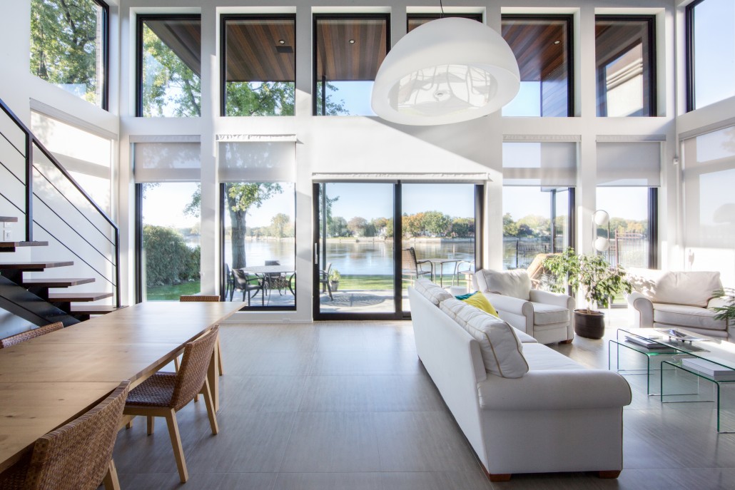 A couple selected the M27 JNCN HOMES model and made it their own dream home. This urban style home is located in the suburbs of a large city and has neighbors on either side. The river is the backdrop for the home’s outstanding feature: extensive fenestration in the rear of the building providing spectacular views. The rooms on the second floor overlook the open concept common area which has a ceiling height of 18 feet.