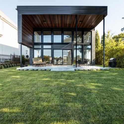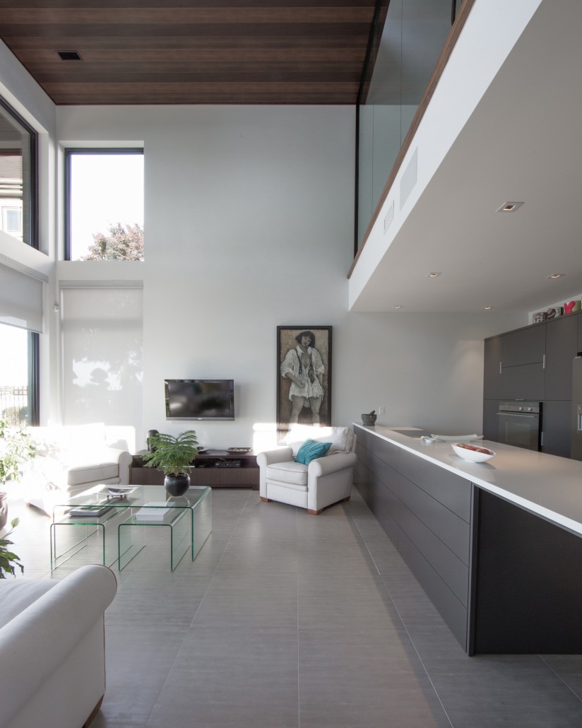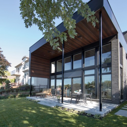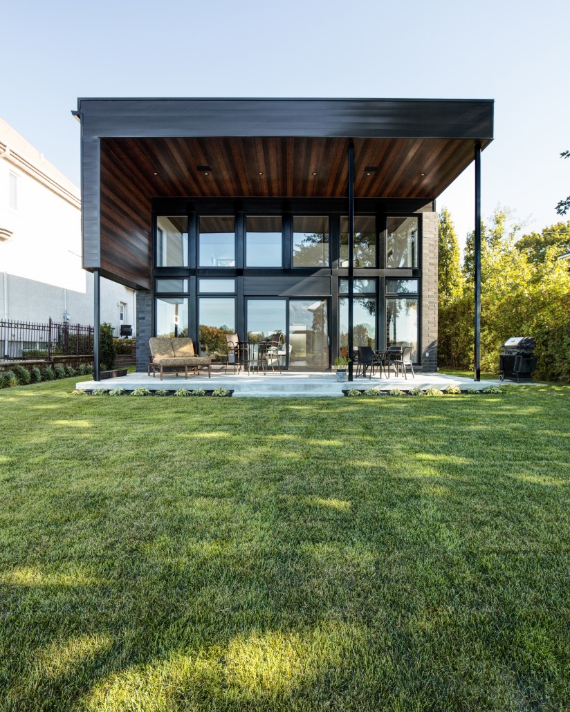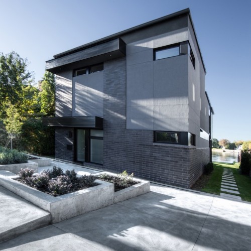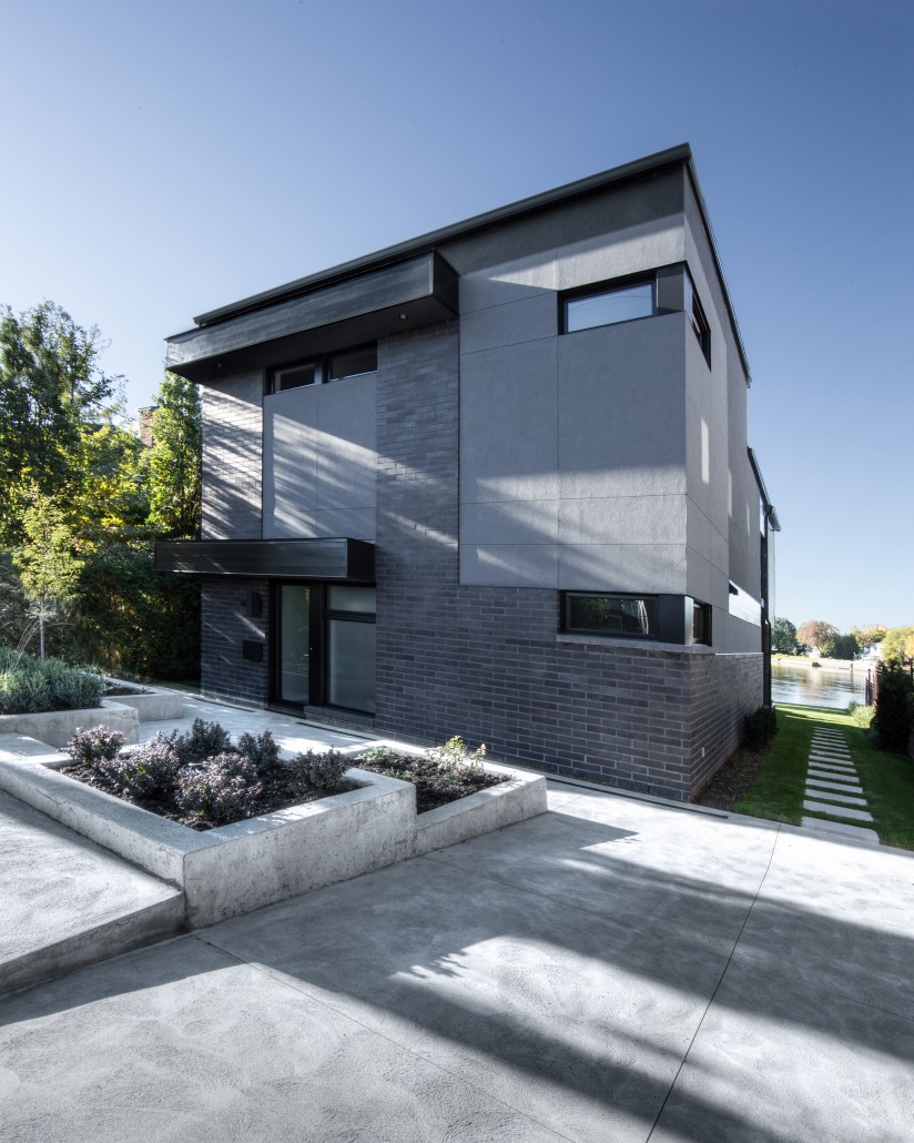 A couple selected the M27 JNCN HOMES model and made it their own dream home. This urban style home is located in the suburbs of a large city and has neighbors on either side. The river is the backdrop for the home’s outstanding feature: extensive fenestration in the rear of the building providing spectacular views. The rooms on the second floor overlook the open concept common area which has a ceiling height of 18 feet.