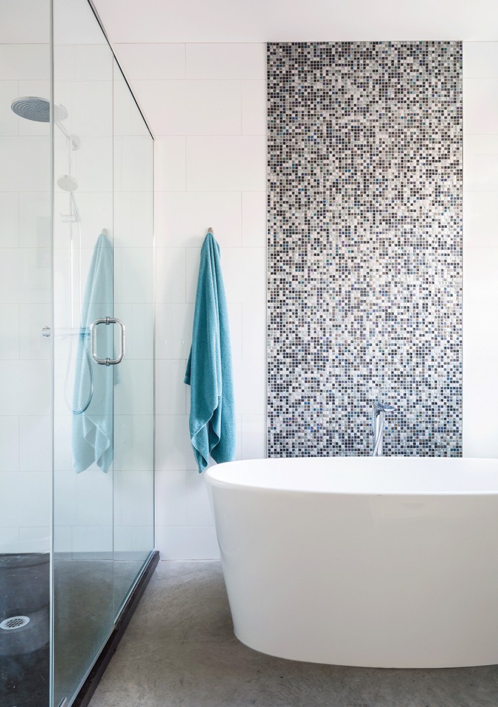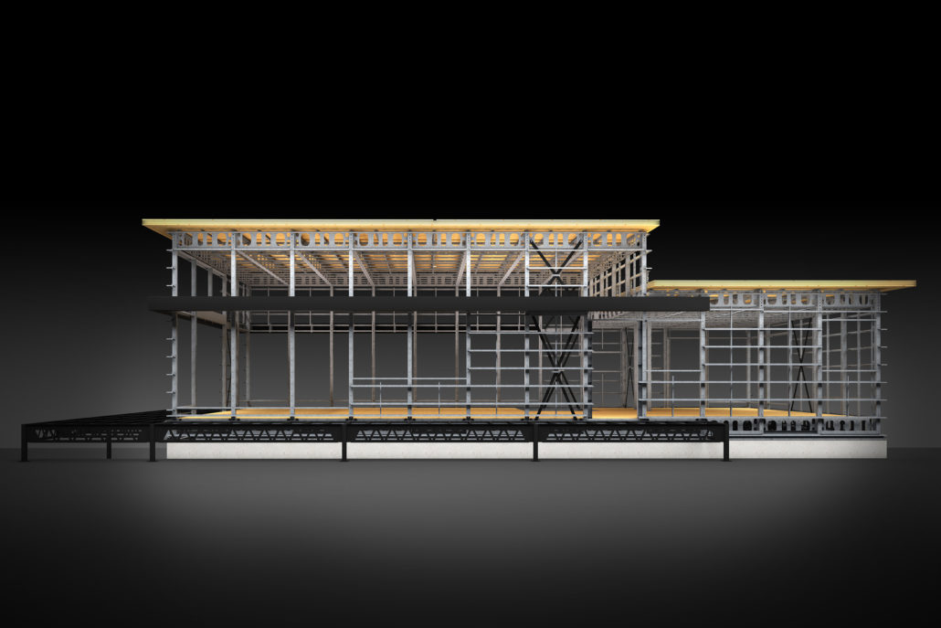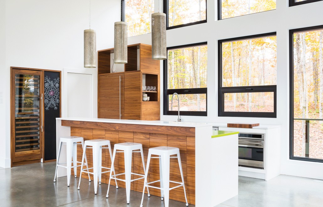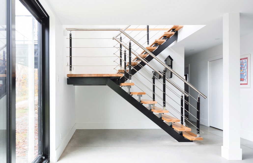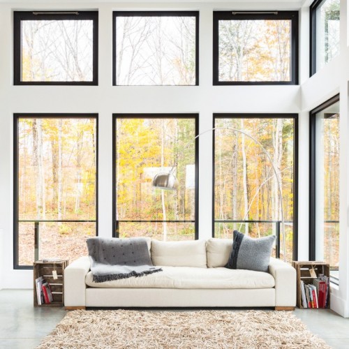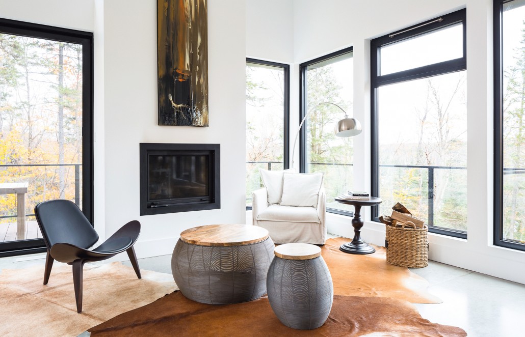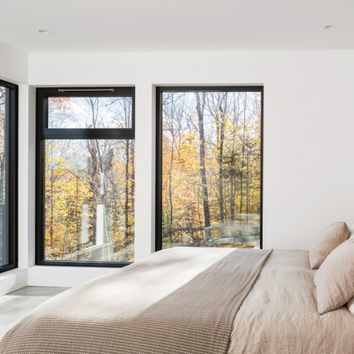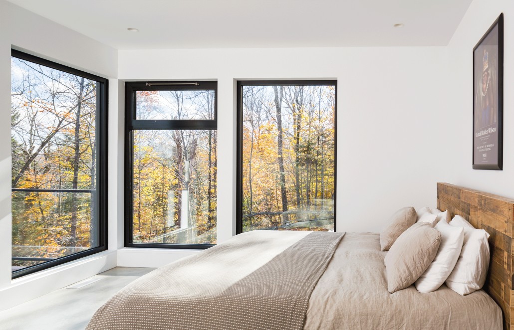 The wrap-around balcony encourages the occupants to step outside and enjoy the natural view of the Laurentians. Indoors, they continue to breathe easy in the completely open-concept main floor. The sense of peace comes from a combination of the open floor plan and the 15’ ceilings above the living and lounge space. The floor to ceiling black aluminum windows allow light to completely flood the social spaces of the main floor and highlight the elegantly simple furnishings of the home. The main floor boasts primarily white furnishings, accented with natural wooden and sandy tones that complement the natural forest outside. Most notably, the kitchen stands out on its own, with its quartz Caesarstone countertop and black walnut natural tone cabinets. The polished concrete flooring that supports this floor is radiant and emits heat as necessary for comfort in the chilly Canadian winter months. The master bedroom has arguably one of the best views in the house and a personal walk-out balcony that allows occupants to completely immerse themselves in it.