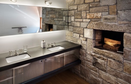 A large stone wall runs through this redesigned home in Connecticut