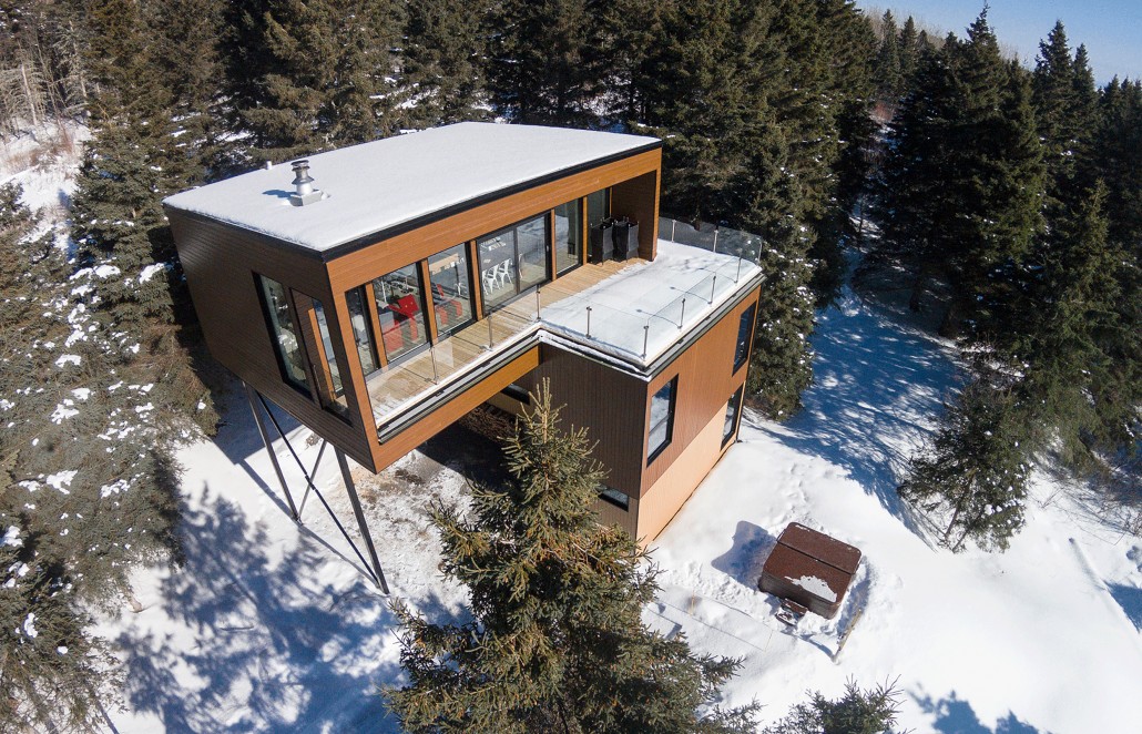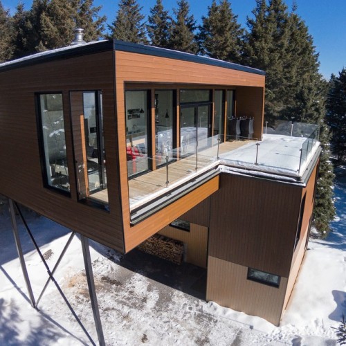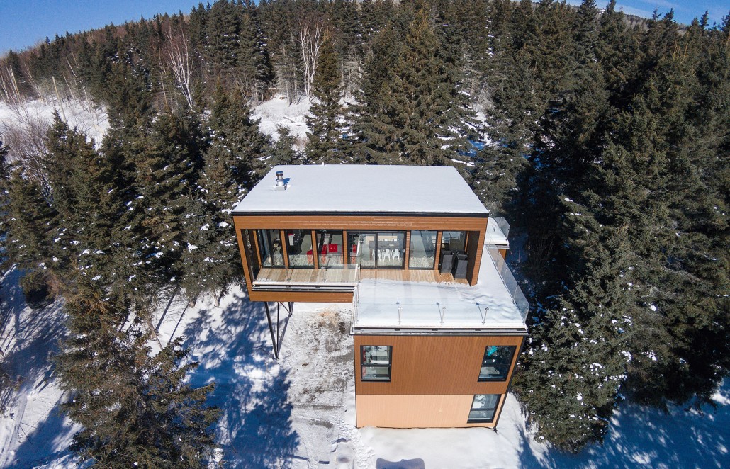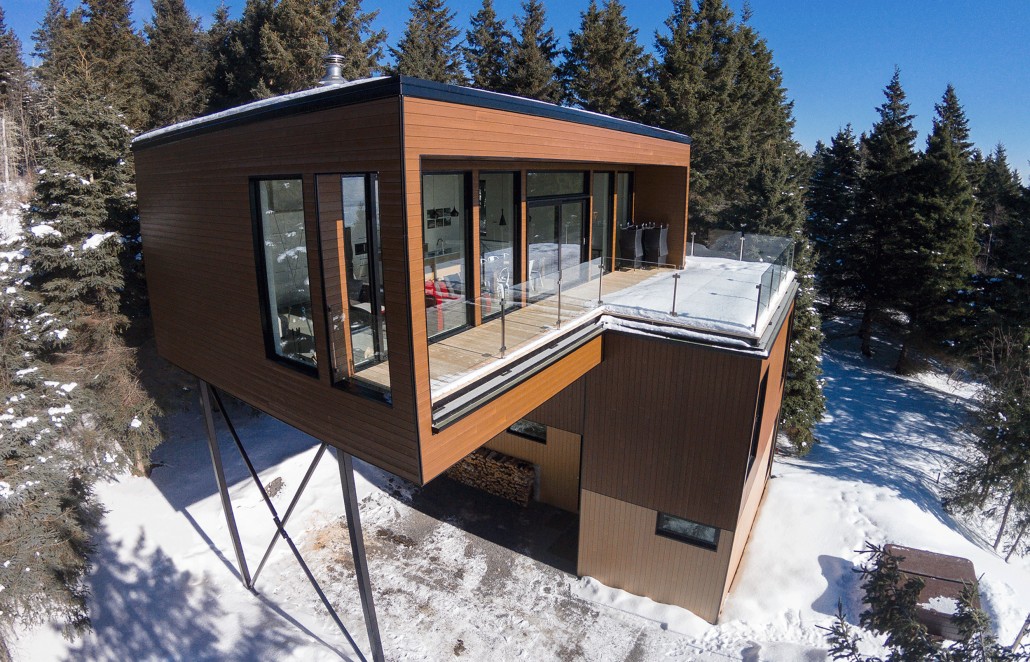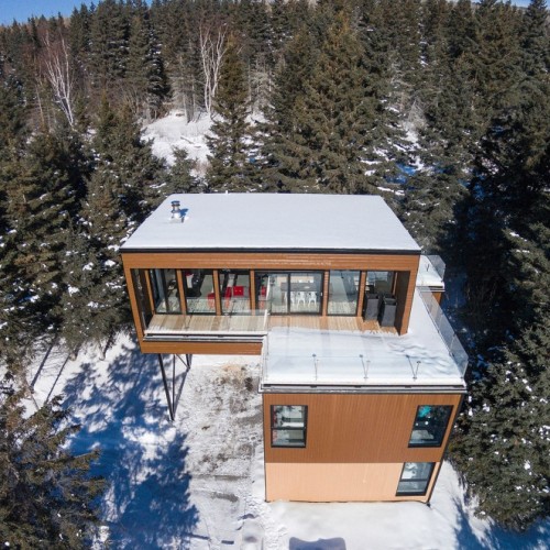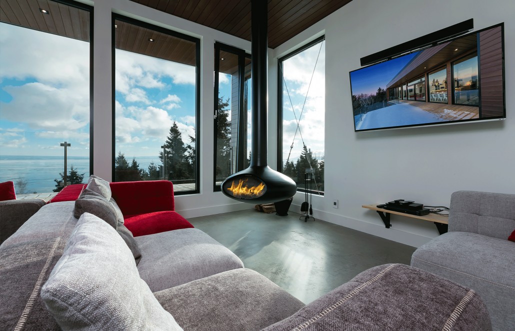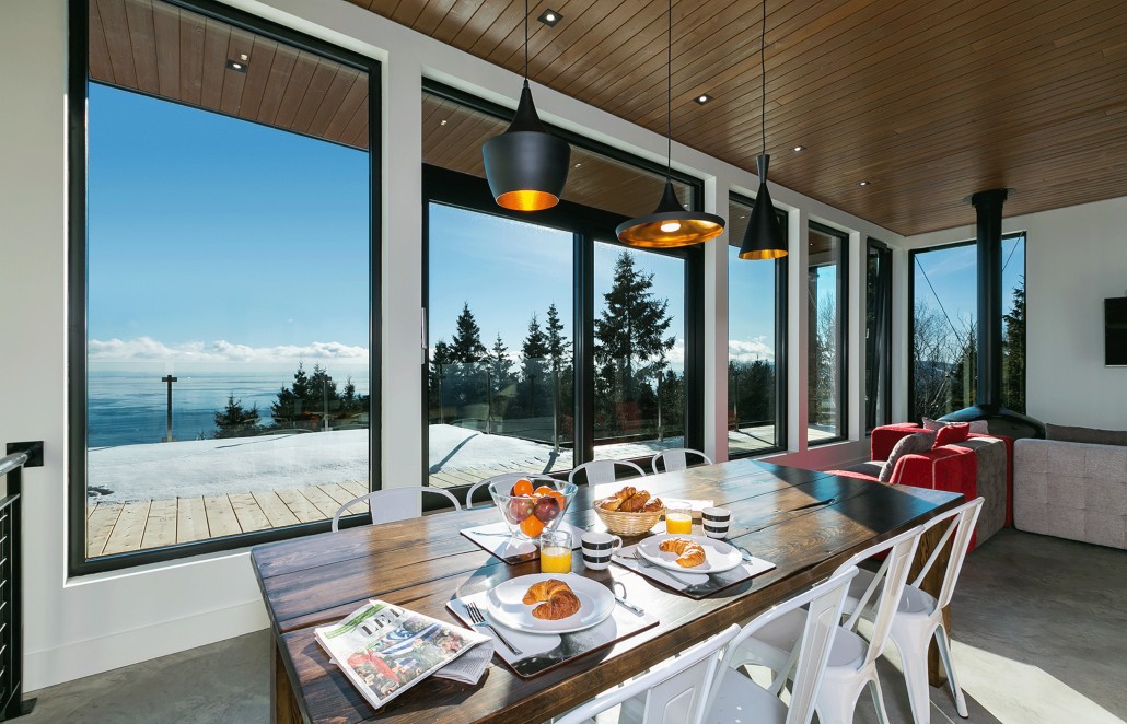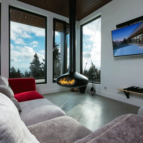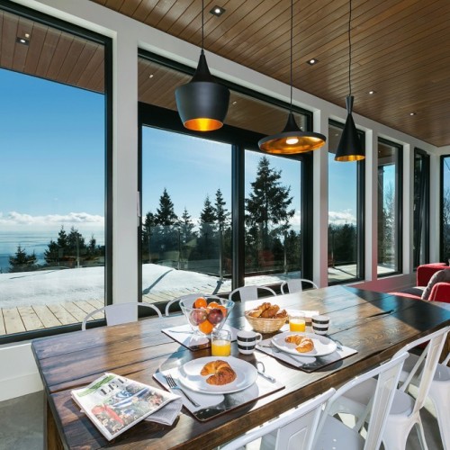 The contemporary architecture style, achievable thanks to the JNCN HOMES construction system, integrates perfectly with the natural surroundings. This cottage located on the Terrasses Cap à l’Aigle in Charlevoix, Qc consists of stacked blocks separating the common living space from the rest of the house. All rooms have views and plenty of natural light. The large fenestration on the upper floor level allows for mesmerizing views on the St-Lawrence river. This open space living area stretches out onto a large terrace.