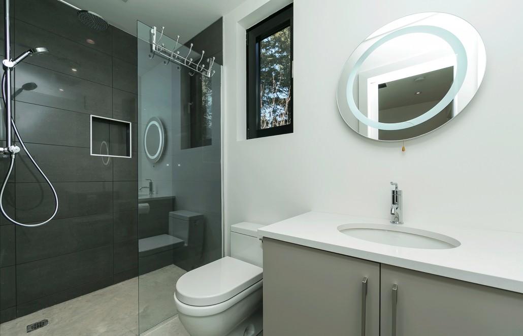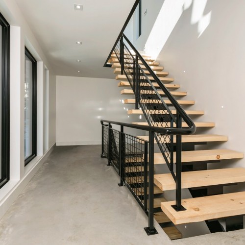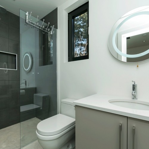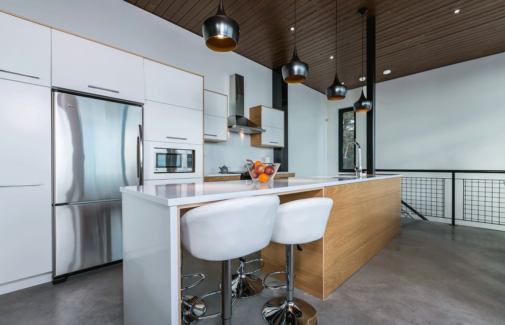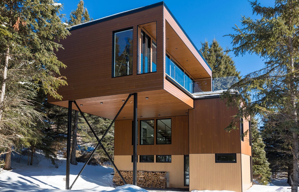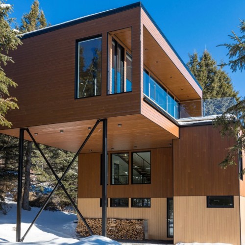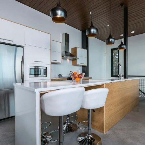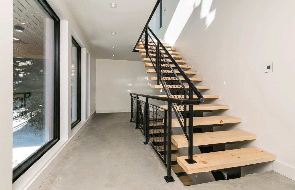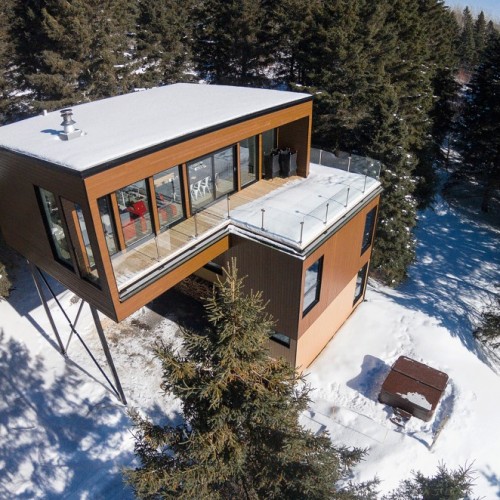 The contemporary architecture style, achievable thanks to the JNCN HOMES construction system, integrates perfectly with the natural surroundings. This cottage located on the Terrasses Cap à l’Aigle in Charlevoix, Qc consists of stacked blocks separating the common living space from the rest of the house. All rooms have views and plenty of natural light. The large fenestration on the upper floor level allows for mesmerizing views on the St-Lawrence river. This open space living area stretches out onto a large terrace.